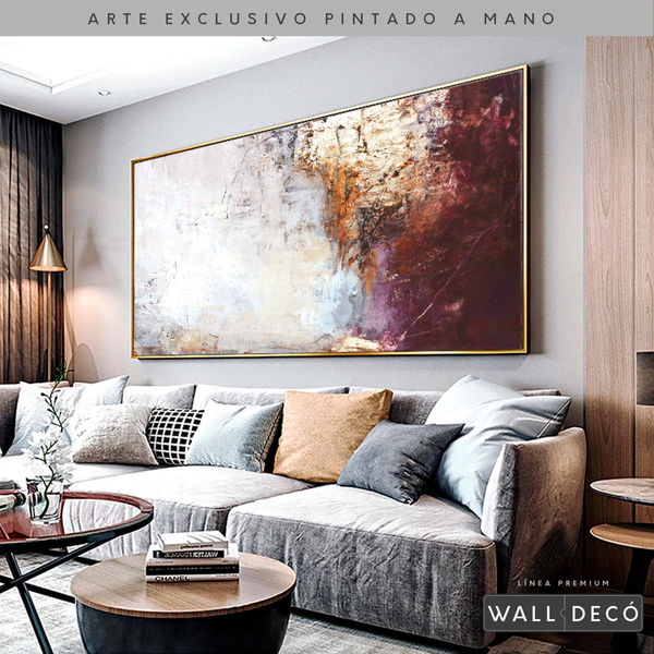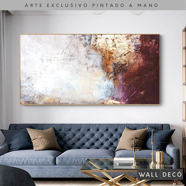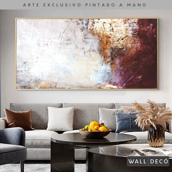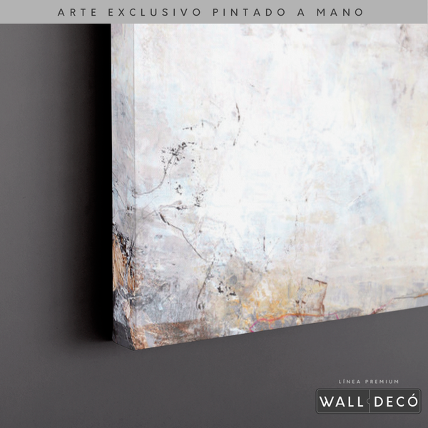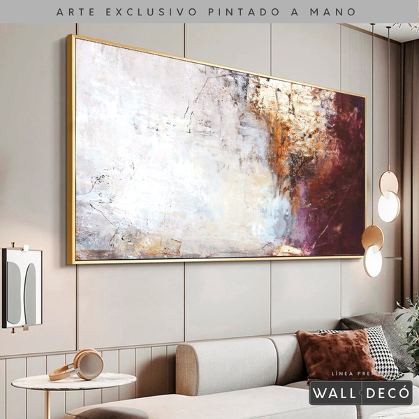 Obra pintada en su totalidad a mano, una pieza abstracta única y diseñada por artistas Wall Decó sobre lienzo 100% algodón, elaborada con acrílicos de alta gama, hojillas doradas y barnizado mate para garantizar la durabilidad.