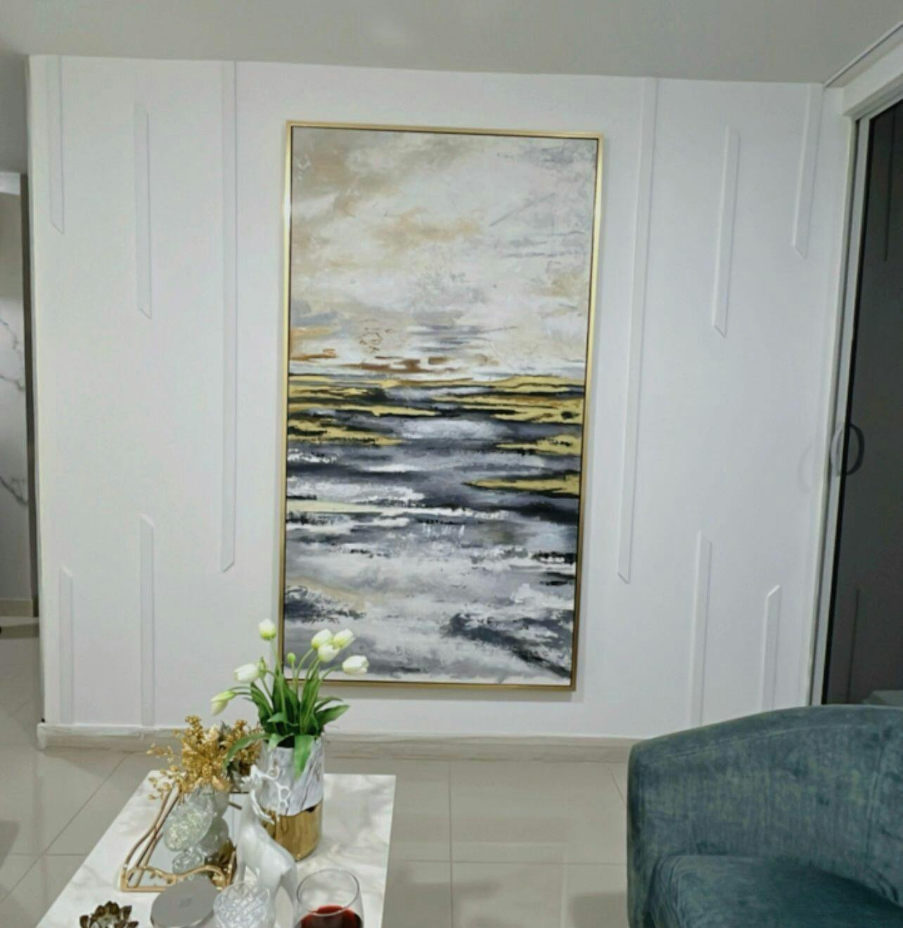 Obra pintada en su totalidad a mano, una pieza abstracta única y diseñada por artistas Wall Decó sobre lienzo 100% algodón, elaborada con acrílicos de alta gama, hojillas doradas y barnizado mate para garantizar la durabilidad.